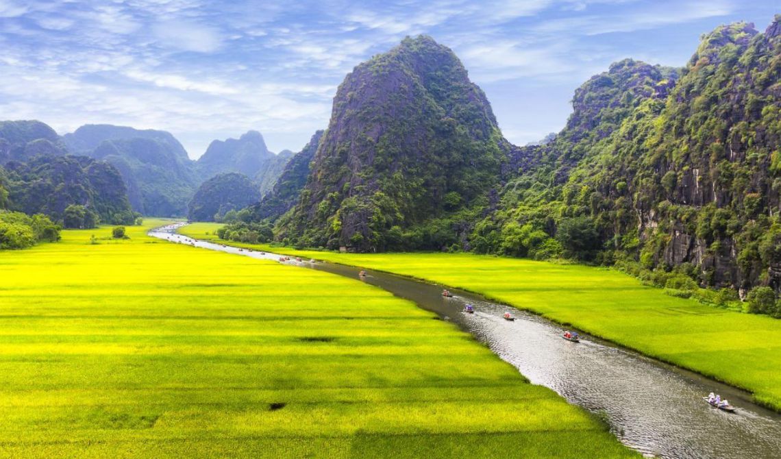 14:00 – Take sampan boat trip which owned and rowed by locals, gently sailing along Ngo Dong river, capturing the wonderful scenery of Karst hills, rice fields, and peaceful villages, and passing “Hang Ca”, “Hang Hai” and “Hang Ba”.
