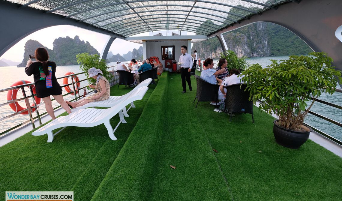 16:30 – Return to Wonderbay Cruises for Afternoon Tea and cruising back toward Tuan Chau harbor. There are a lot of time for sunbathing on upper deck with music, enjoy great fun of group touring fellows among world iconic natural scenery.